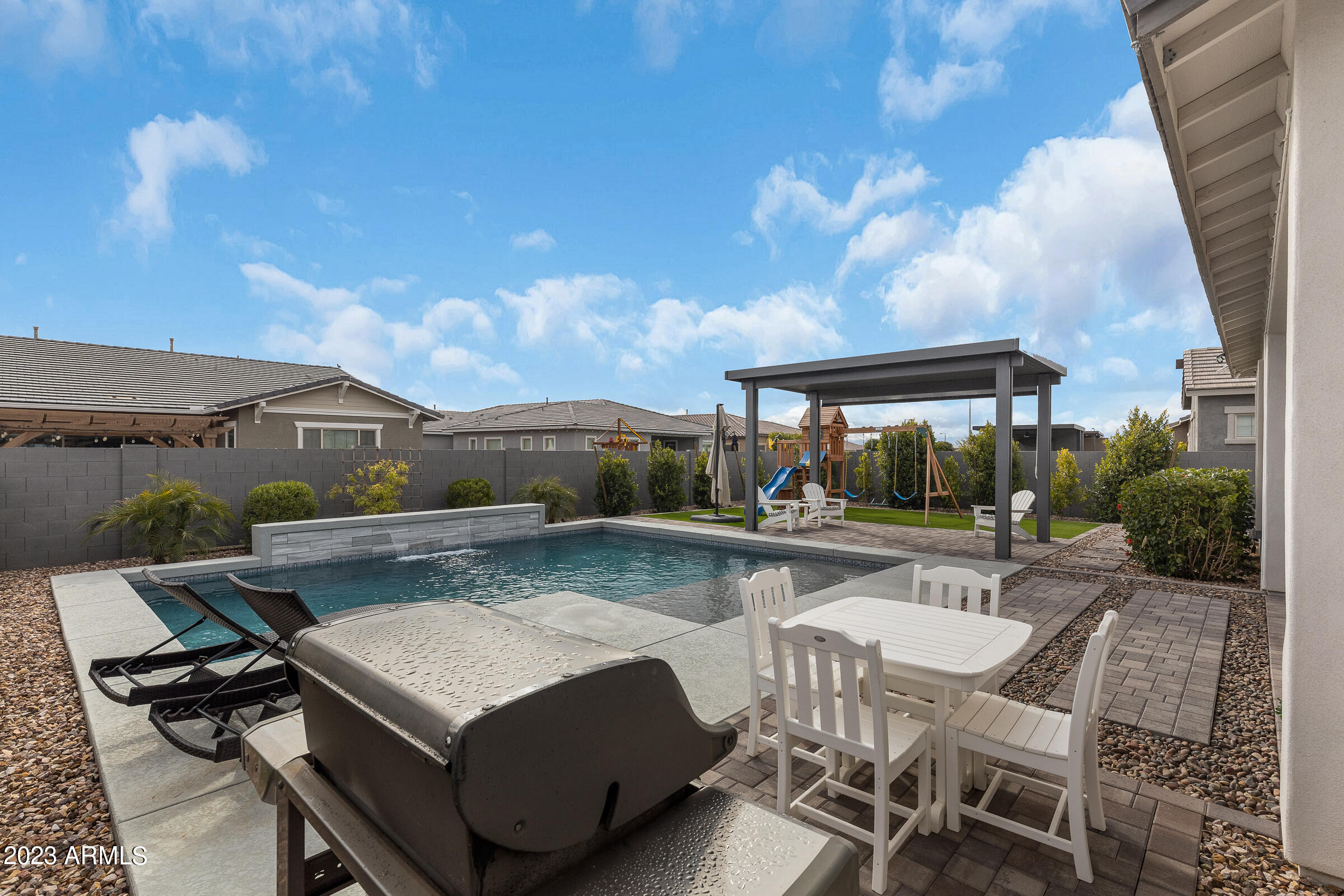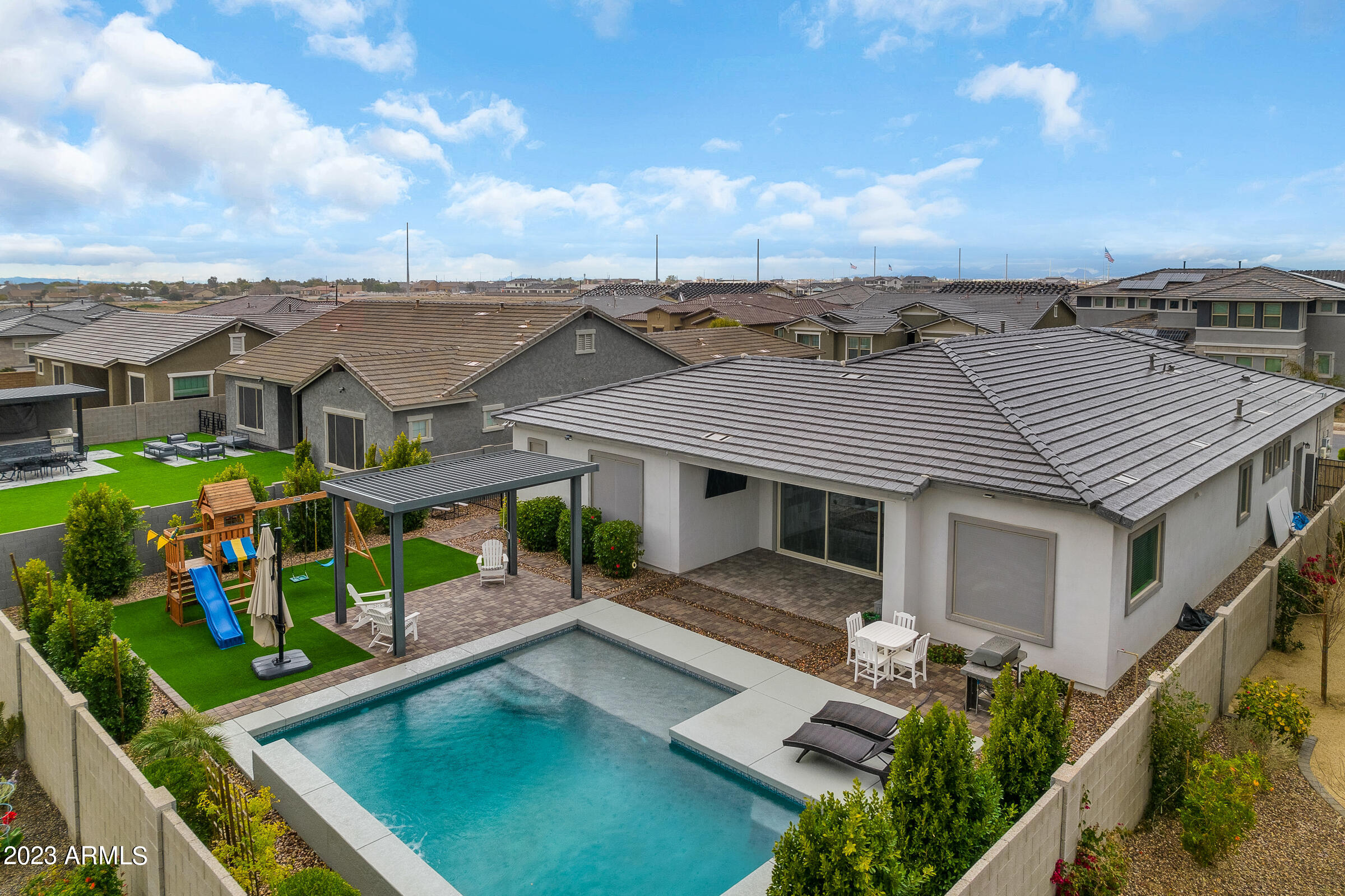 Welcome to the highly sought-after Spur Cross gated community, where this exquisite home awaits. Boasting 4 bedrooms, including one with a charming barn door, a Teen room AND a versatile Flex room with French doors that lead to a serene side yard patio. As you enter through the front door, the expansive hallway offers a glimpse of the inviting backyard featuring a refreshing pool, commercial-grade misters, a pergola, lush turf and a play structure. This home is adorned with solar panels, multiple accent walls and custom built-ins, creating a unique and stylish ambiance. Enjoy modern amenities like a farmhouse sink, mud room, wood-plank tile flooring, remote control ceiling fans throughout and a triple glass slider that seamlessly connects indoor and outdoor living spaces. Channel your inner chef in the beautiful kitchen, equipped with stainless steel appliances that invite you to create delicious meals and culinary delights. The kitchen also offers a butler's pantry while the neighboring great room is equipped with automated drop-down shades and substantial built-ins.