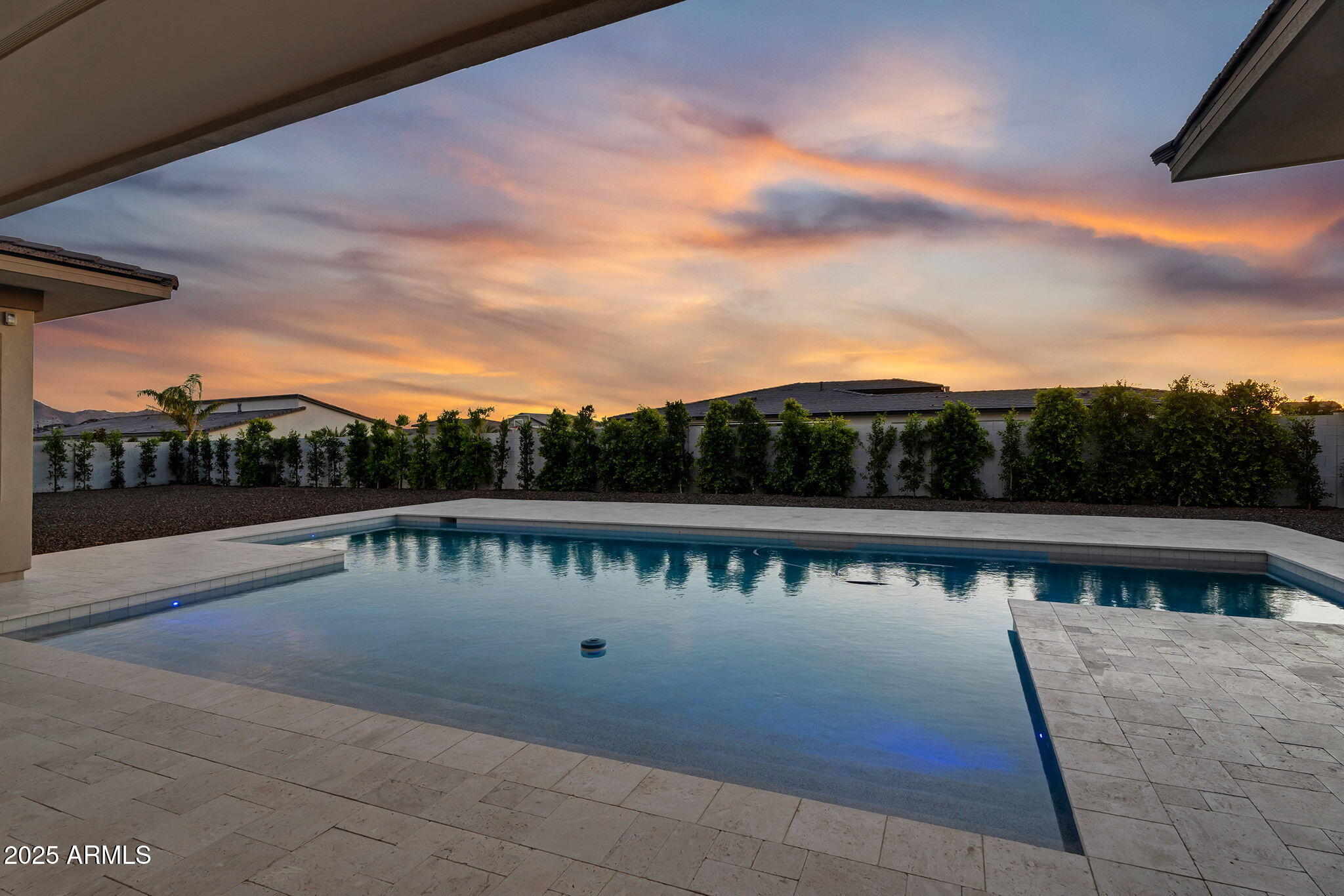 At the heart of the home is a chef's dream kitchen, complete with KitchenAid stainless steel appliances, an oversized island, upgraded cabinetry, sleek hardware, and a designer backsplash. Step through a dramatic 20-foot, 4-panel glass slider that opens fully to reveal an expansive backyard oasis. The oversized pool, complete with a Baja shelf, takes center stage and is surrounded by plenty of space for entertaining. The large covered patio offers the perfect setting for al fresco dining and relaxation, while the breathtaking sunset views complete this outdoor paradise.
