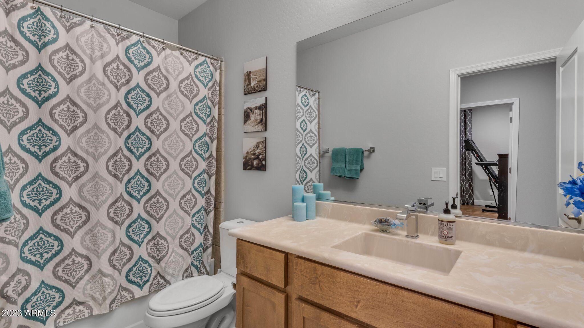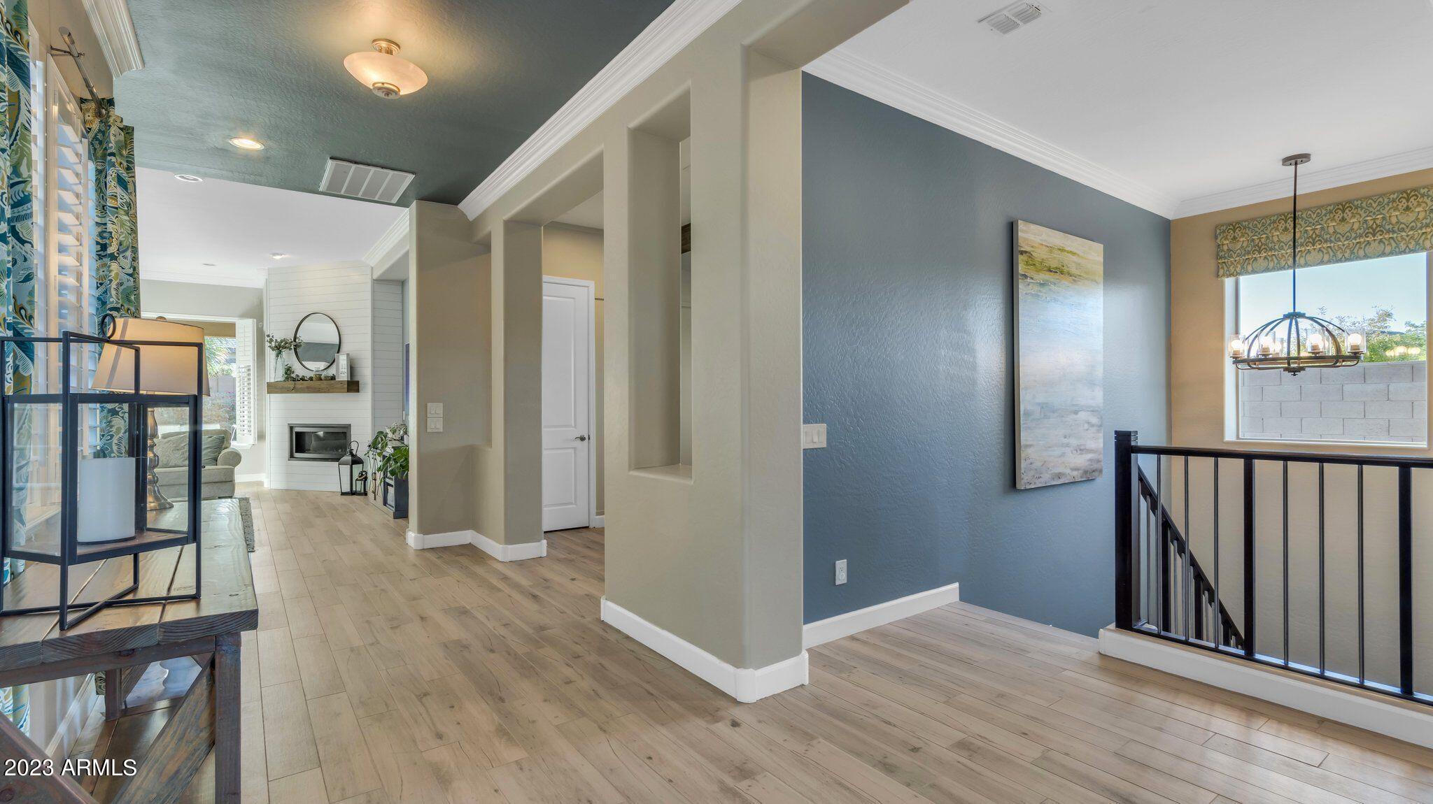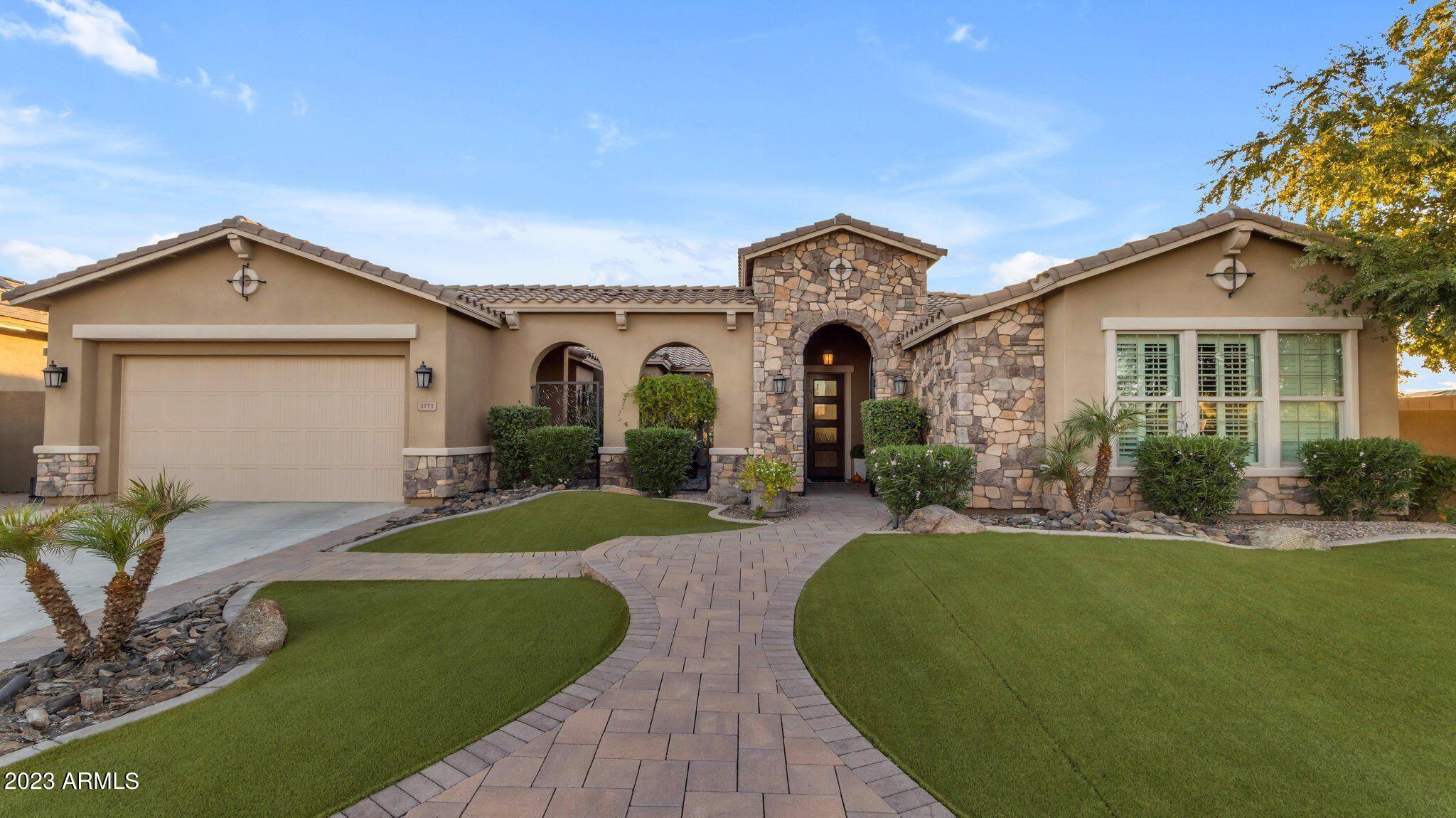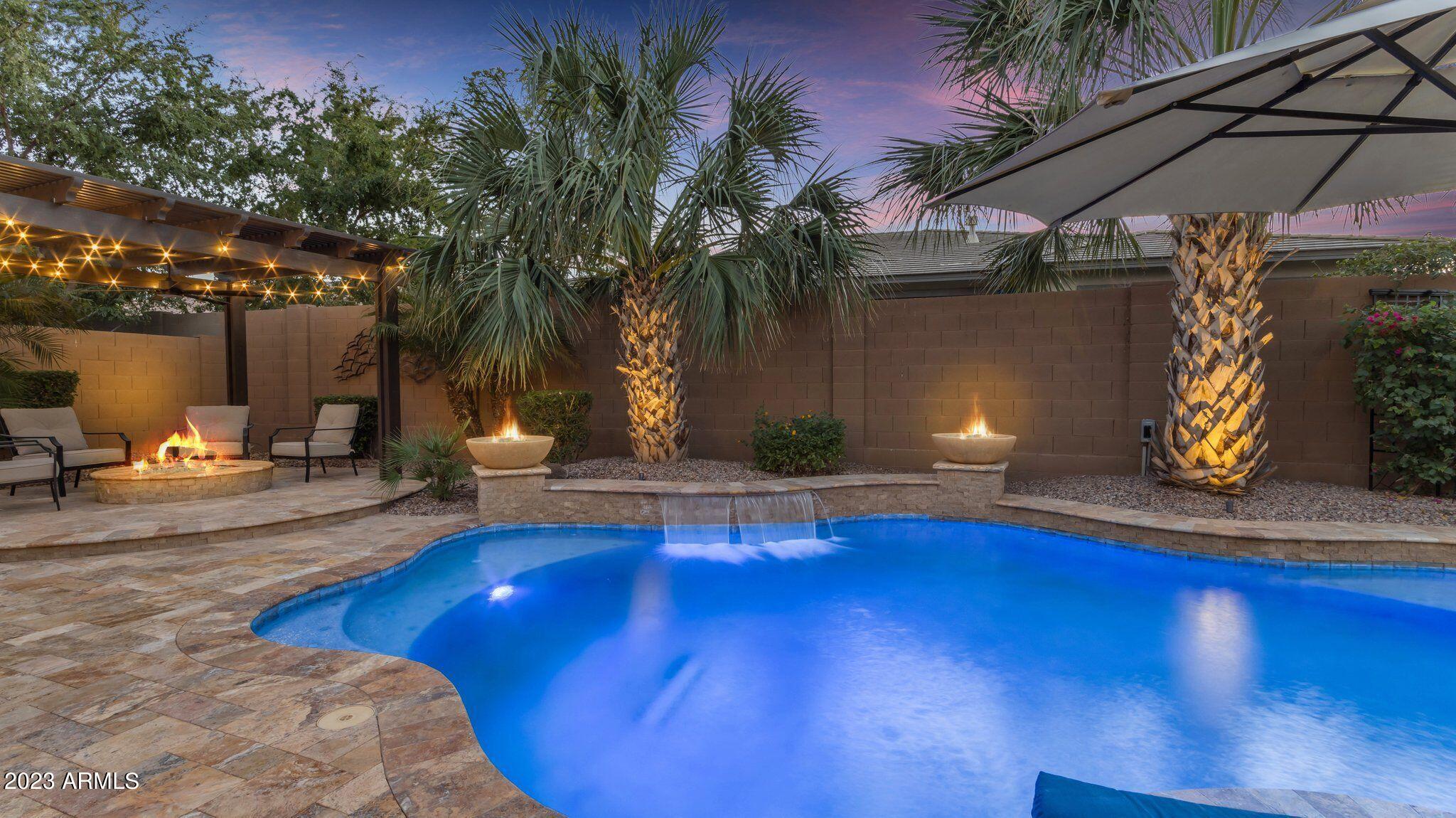Basement home in the highly sought after Bridges community! Get ready to be blown away by this picturesque 480-acre master planned community that offers a perfect mix of luxurious living and family-friendly fun. Take a stroll along the trails and be amazed by the stunning waterfalls, serene lakes, and lush greenery that surround you. There are so many great parks, a splash pad, catch and release fishing, and sports courts. But it's also home to the highly rated Bridges Elementary School and directly next to Gilbert Regional Park where kids can enjoy a A 17-foot tall playground, plenty of basketball, pickleball and volleyball courts. This former model home that will take your breath away! As you walk through the courtyard, the cozy gas fireplace welcomes you into the grand foyer. The open-concept living room and recently remodeled kitchen is perfect for cozy nights in or entertaining guests with plenty of space to spare. The main level offers a spacious home office plus den or 6th bedroom. A large master with a beautiful private bath and large closet and the other two bedrooms also offer their own bathrooms. Step down to the basement and find yourself in a room of possibilities that could be used as a game room, home theater, or even a home gym. Additionally, the basement offers two large bedrooms and the beautiful freshly remodeled backyard boasts impeccable landscaping, a private pool, basketball court, removable pool fence and ramada And to top it off, you have the perfect ambiance for entertainment with the fire pit and fire features around the pool.